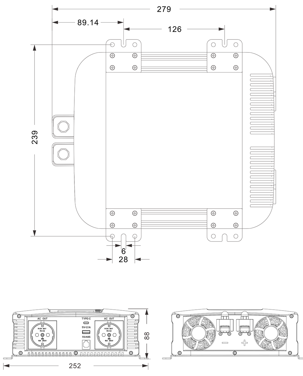 Nota 1. Ujian nilai dengan voltan input pada 12.8V/25.6V/50.4V; 2. Semua parameter diukur pada beban undian, 25 suhu ambien;
